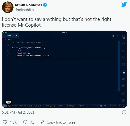 一位从事开源工作的开发者 Armin Ronacher 直接在 Twitter 上分享了一个示例,表明 Copilot 确实存在剽窃版权代码的可能。