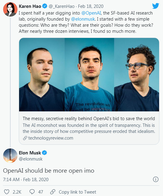 早在 2020 年 2 月,麻省理工科技评论的记者 Karen Hao 就发表了一篇文章,探究了 OpenAI 与微软的合作。Karen Hao 在“The messy, secretive reality behind OpenAI’s bid to save the world”一文中明确指出,经过对 OpenAI 内部员工的数次采访,她发现 OpenAI 的公开宣称内容(实现通用人工智能、使人类平均受益)与内部的运营方式存在不一致之处。
