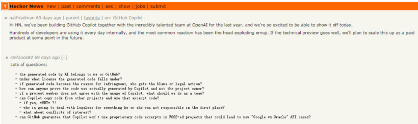 当时,GitHub 的首席执行官 Nat Friedman 公布这则消息后,Hacker news 上已经有不少网友在讨论,Copilot 可能会存在潜在的法律风险。