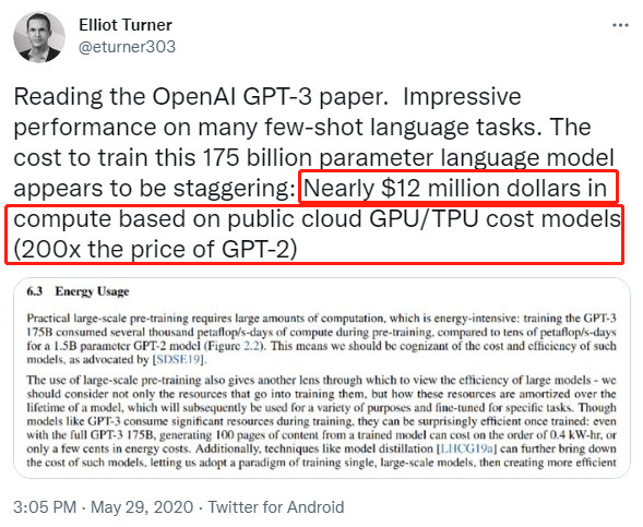 作为一个高定位的人工智能研究实验室,OpenAI 的雄心壮志要求它必须获取足够的资源支持,其中,金钱始终是排在第一位。比方说,去年夏天火热全网的 GPT-3,在训练阶段就已花费了大约 1200 万美元:
