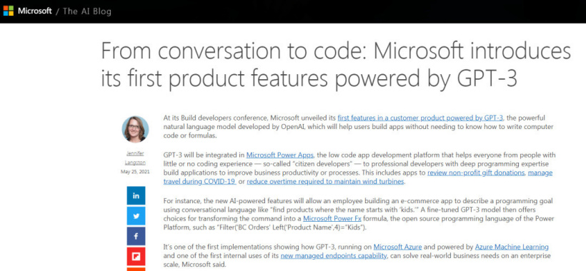 OpenAI 的结构改了之后,没几个月,微软就注资了 10 亿美元。而微软与 OpenAI 的合作关系,是基于一个重要前提,即微软有权将 OpenAI 的部分技术商业化,比如 GPT-3 与 Codex。今年 5 月末,微软的官方网站便报道了他们用 GPT-3 的技术赋能内部商业产品,为用户服务: