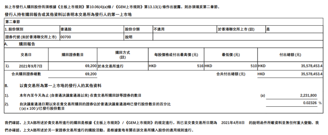 昨日晚间,腾讯控股发布公告称,回购 6.92 万股股份,耗资约 3557.8 万港元,为连续第八个交易日进行回购。统计数据显示,腾讯至今累计购回 223.18 万股,占公司股本 0.02326%。