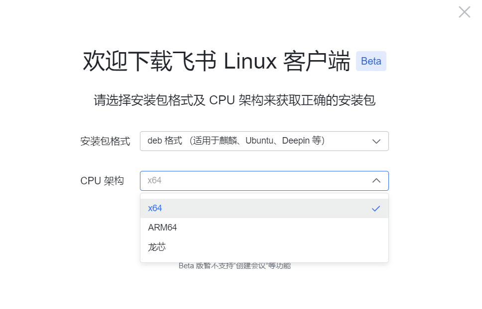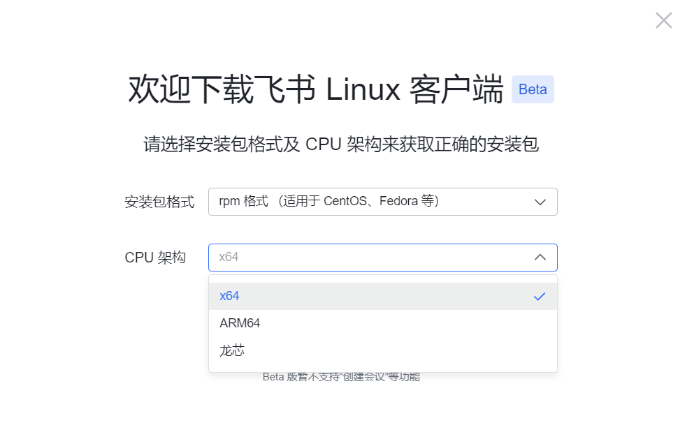 此外,飞书官网已上线 Linux 版下载地址,用户可手动下载 deb 或 rpm 安装包,适用于 Ubuntu 系列与 CentOS 系列的多个操作系统,支持 X64、ARM64 与龙芯 CPU。
