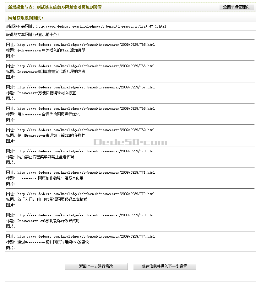 全部完成并检查无误后,单击“保存信息并进入下一步设置“。如果之前设置正确,单击后,将会进入“新增采集节点:测试基本信息及网址索引页规则设置的网址获取规则测试”页面并看到相应的文章列表地址。如(图21)所示,