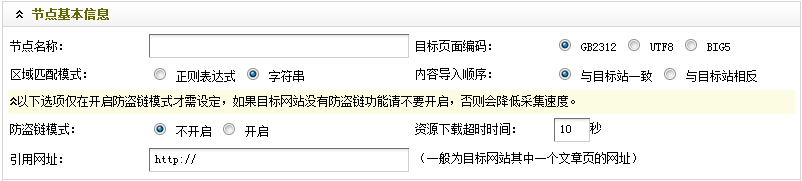 “引用网址”:填入任何一个即将被采集的文章内容页面的网址。