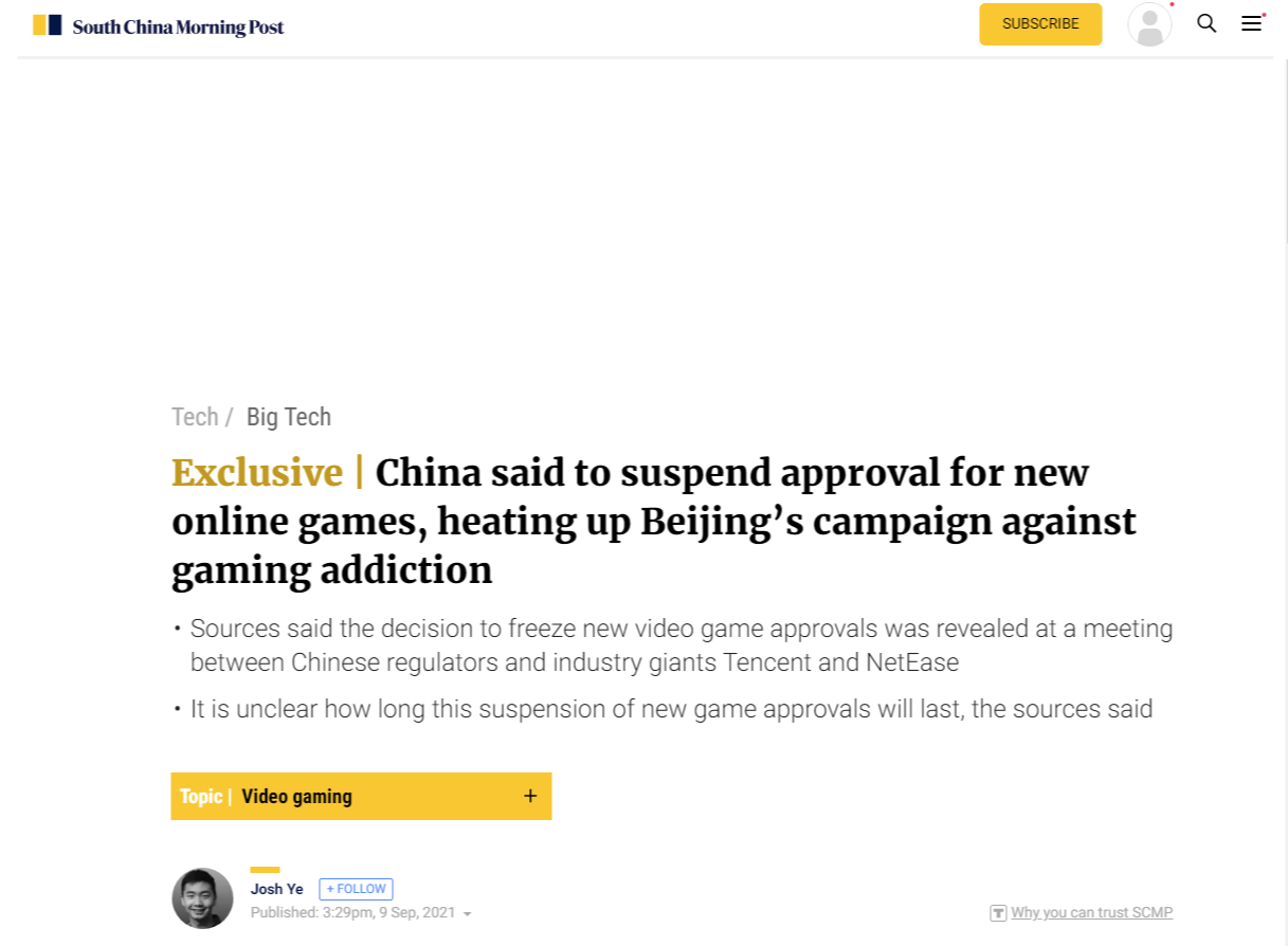 《南华早报》今日援引知情人士话称,在相关部门与腾讯、网易举行的关于限制未成年人游戏时间的会议上,监管机构透露将暂停所有新网络游戏的审批,但此次停审具体持续多久暂时不明。