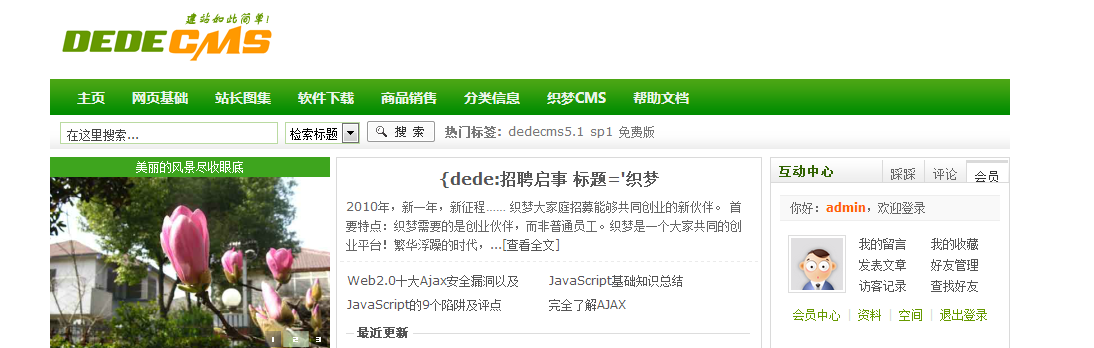 打开dedecms的网站后台管理(对了,请先安装安装数据体验包,这样才有测试数据)