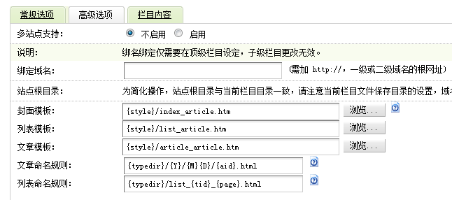 依此类推,如果在常规选项中栏目属性是最终列表栏目,高级选项中封面模板为{style}/list_article.htm,则会调用list_article.htm作为模板,文档模板也依此类推。