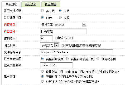 常规选项中栏目属性是频道封面