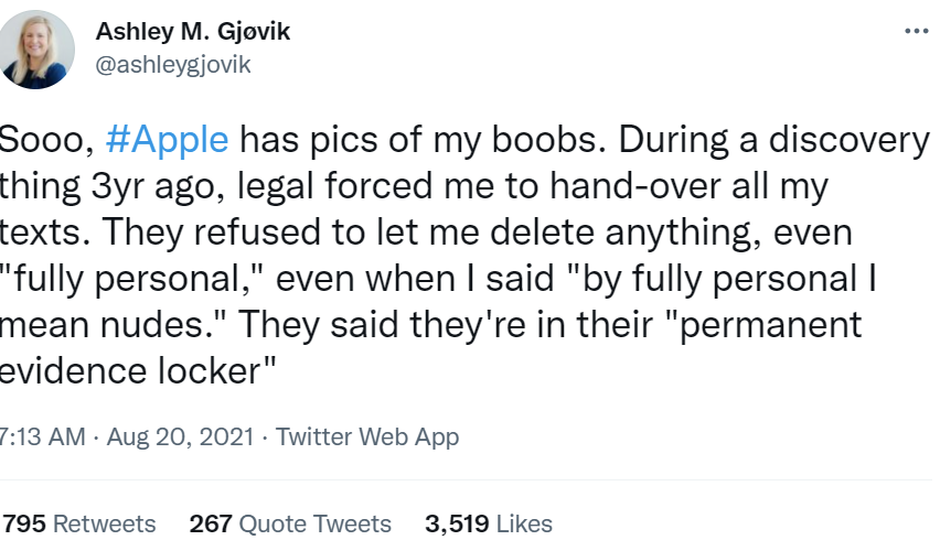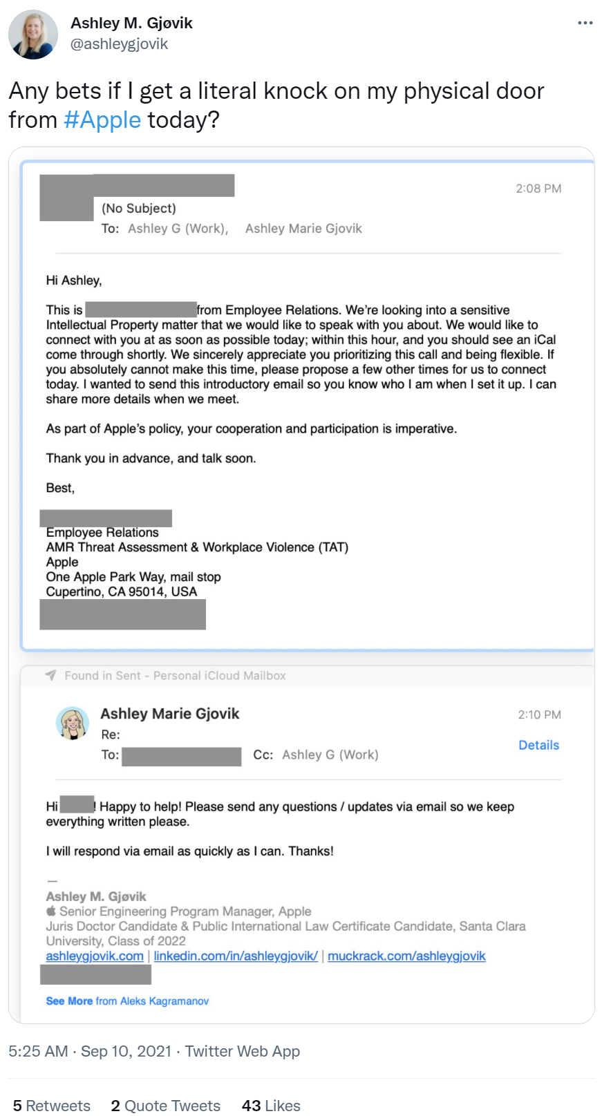 今天早些时候,苹果员工关系团队的一名成员联系了 Gjøvik,称公司正在调查一个敏感的知识产权问题,并希望在一小时内与她通话。