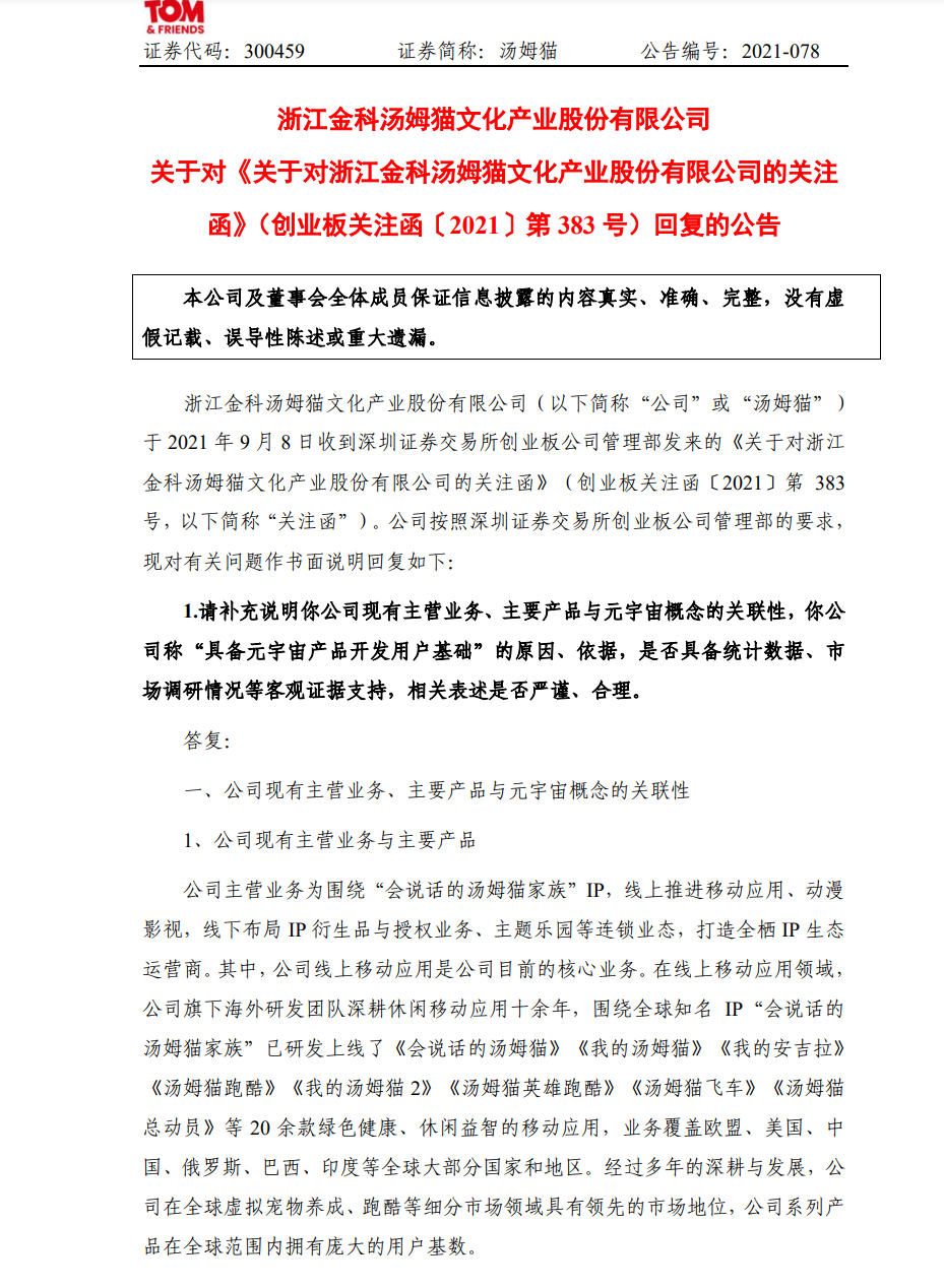 ,9 月 8 日,汤姆猫收到深交所关注函,要求说明公司现有主营业务、主要产品与元宇宙概念的关联性,公司称“具备元宇宙产品开发用户基础”的原因、依据,是否具备统计数据、市场调研情况等客观证据支持,相关表述是否严谨、合理;公司是否存在利用互动易回复蹭热点、炒概念,配合股东减持的情形。