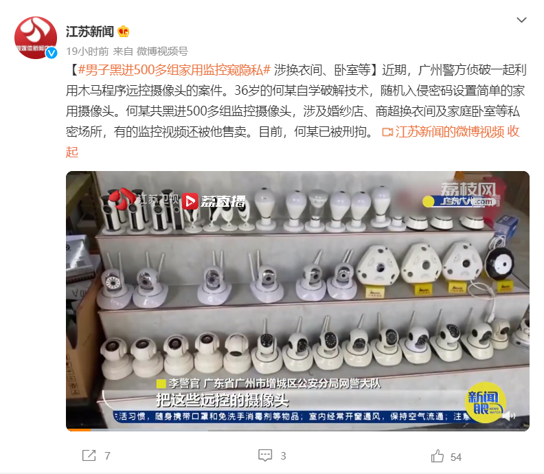 广东省广州市增城区公安分局网警大队的李警官表示,经过审查,犯罪嫌疑人何某供认,从 2019 年 12 月起,他开始收集监控摄像头的权限信息,进而非法获取拍摄内容,用于何某自己观赏和与群友交流,甚至还会对不同场所的监控摄像头视频进行售卖。