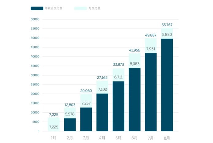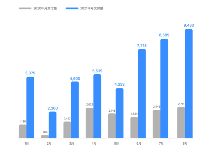 理想官网显示,今年 8 月份,理想共交付了 9433 辆,同比增长 248%,环比增长 9.8%,已经实现了从 6 到 8 月连续三个月正增长。今年前 8 个月,理想已经完成了 4.82 万辆的总销量。