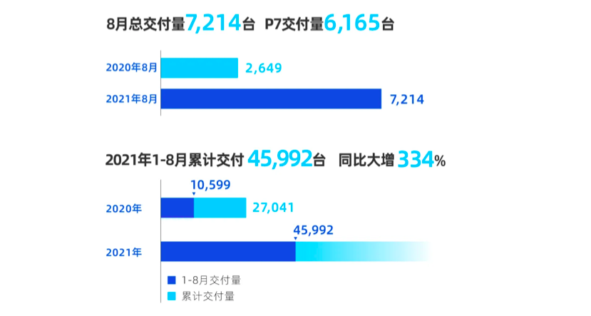 小鹏的在 8 月份也完成了 7214 辆的销量成绩,这已经是小鹏第二个月销量超过 7000 辆,其中小鹏 P7 上个月的销量达到了 6165 台,连续四个月实现了销量的增长。今年前八个月,小鹏也已经累计交付了 4.6 万辆。