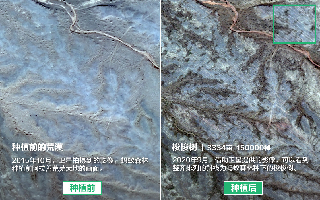 2020 年 9 月,蚂蚁森林联合专业机构为 277 号林拍摄过卫星影像,可以看到整齐排列的斜线为蚂蚁森林种下的梭梭树,与 2015 年同一地区种植前的卫星图形成鲜明对比。