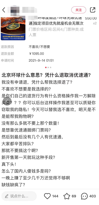 14 日消息 今天 0 时,北京环球影城门票正式开售,开售半小时内,平台上中秋期间门票“秒光”,无限次优速通也已售罄,随后有多名网友在社交平台发文称自己在飞猪抢到的环球优速通,在没有主动申请退票的前提下被退票了。