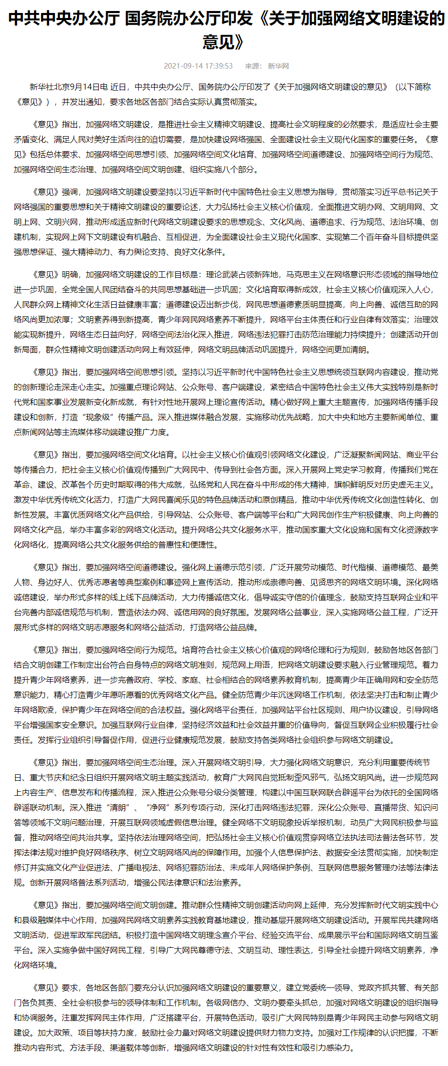 14 日消息 据新华社,中共中央办公厅、国务院办公厅今日印发《关于加强网络文明建设的意见》。