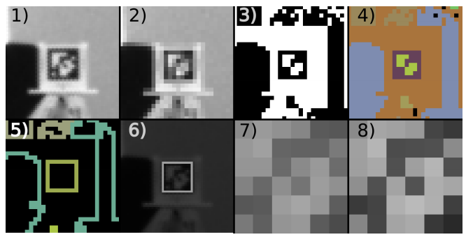 而 AprilTag 算法的主要内容则包含边缘检测、四边形检测,以及对 Tag 的编解码: