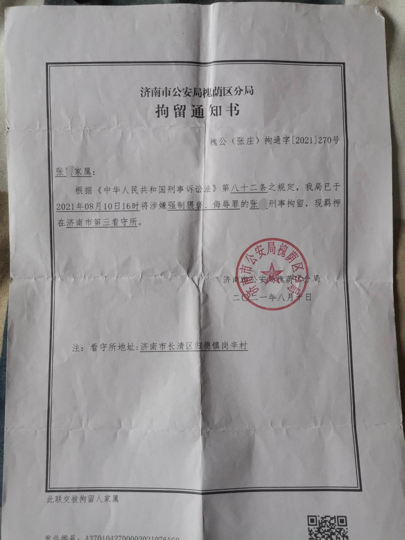 张某姐夫:具体问了几次我记不清楚了,开始是在七贤派出所,后来案件转到张庄派出所,我知道 8 月 8 日张某被警方叫到张庄派出所,又被转到槐荫区办案中心,晚上放出来了;8 月 9 日我送他去槐荫区办案中心,我等到 12 点警方让我回去,第二天(8 月 10 日)晚上 10 点,警方打电话通知我张某被刑拘了,让去签字。