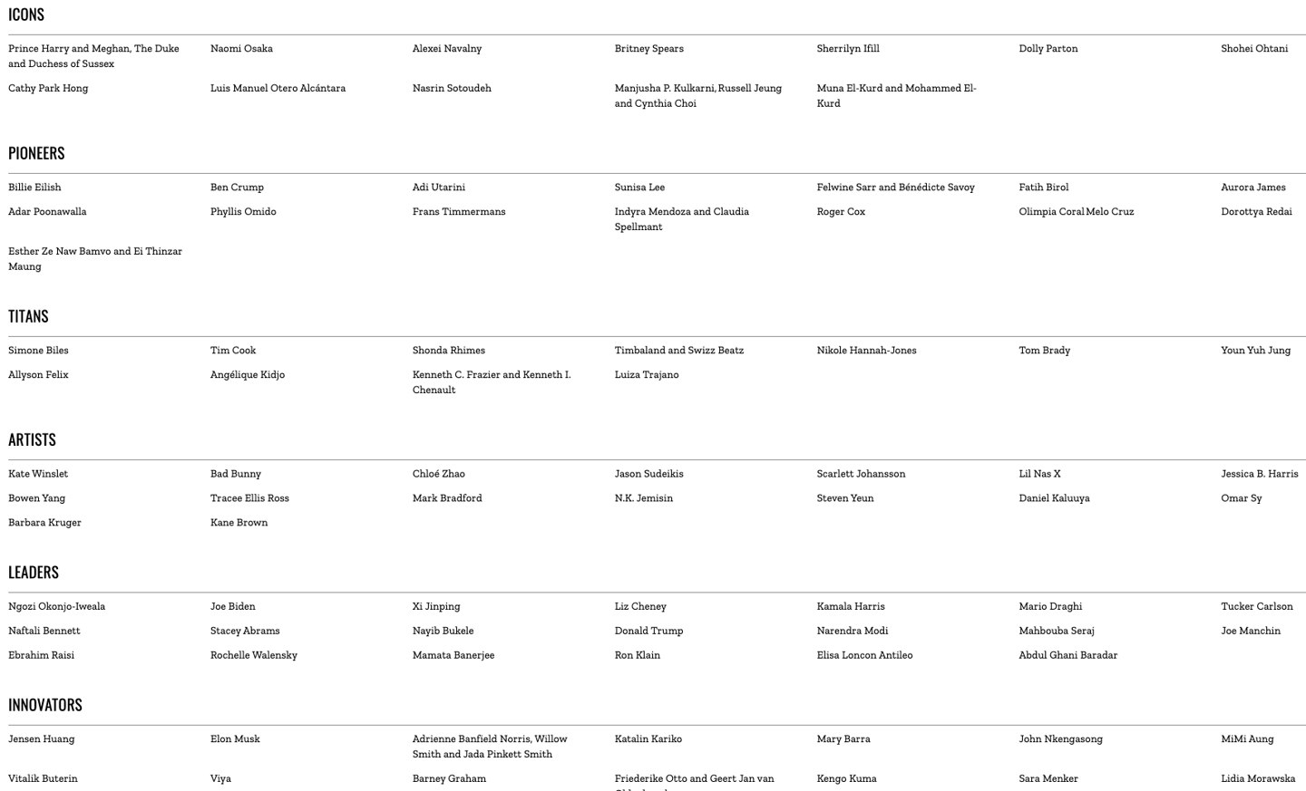 《时代》把今年的榜单分为了 6 个部分,包括时代偶像 (ICONS)、先锋 (PIONEERS)、业界泰斗 (TITANS)、艺术家 (ARTISTS)、领袖 (LEADERS)、创新者 (INNOVATORS)。