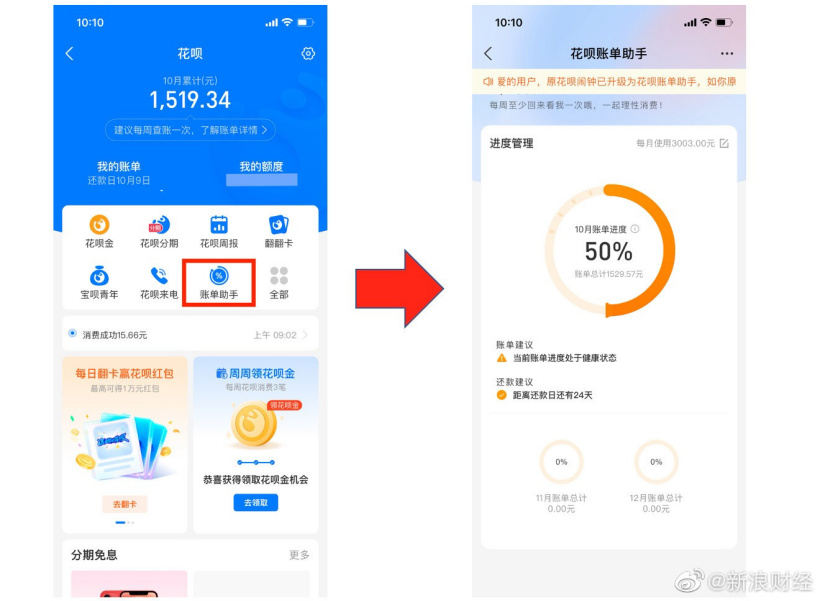 16 日消息 网友发现,花呗近期上线了账单助手,新增账单管理、进度提醒、超额预警、还款建议等新功能。