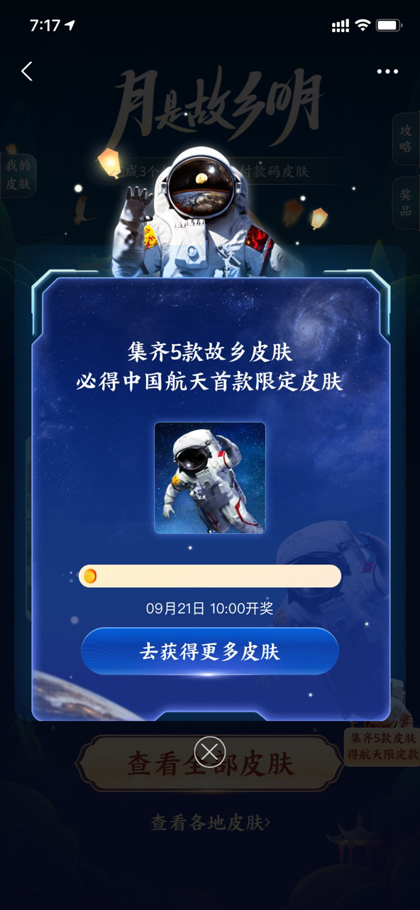 用户如果集齐了五款皮肤,就会得到中国航天中秋限定款皮肤。用户在集齐五款皮肤后,可在 9 月 21 日到活动会场开彩蛋,必得中国航天中秋限定款皮肤。