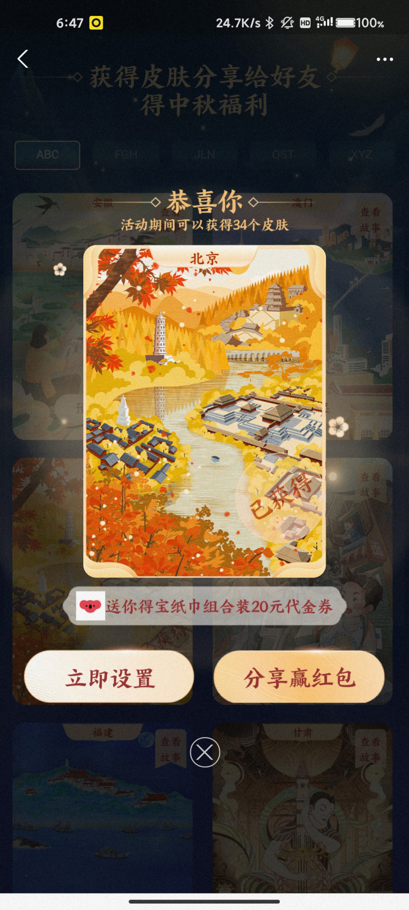 此外,用户在获得和分享皮肤的同时,还可以机会获得支付宝发放的中秋惊喜消费红包。
