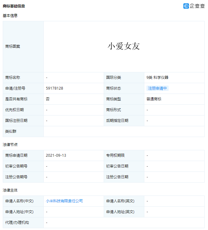 17 日消息 近日,小米科技有限责任公司申请注册小爱女友商标,国际分类涉 9 类科学仪器,企查查 App 显示,目前商标状态为注册申请中。