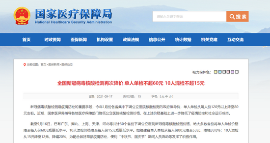 截至 9 月 16 日,已有广东、湖北、上海、天津、河北等共计 30 个省份下调公立医院新冠病毒核酸检测价格,绝大多数省份将单人单检价格降至每人份 60 元或更低水平,10 人混检价格降至每人份 15 元或更低水平。如福建省单人单检从每人份 80 元降至 53 元,降幅 33.8%;10 人混检从 15 元降至 12 元,降幅 20%,为配合做好局部疫情防控,便利“中秋节、国庆节”期间人员流动等发挥了积极作用。
