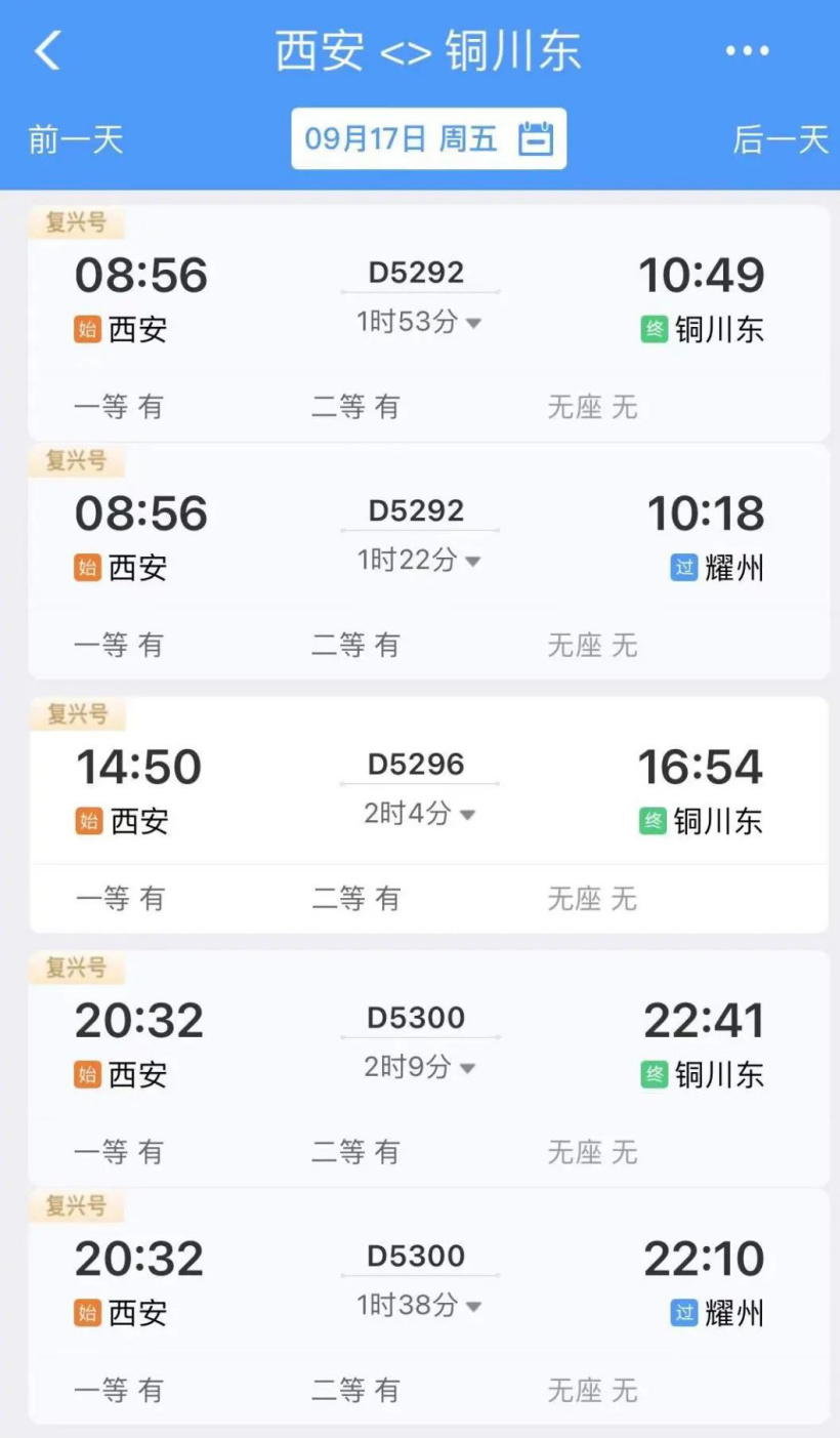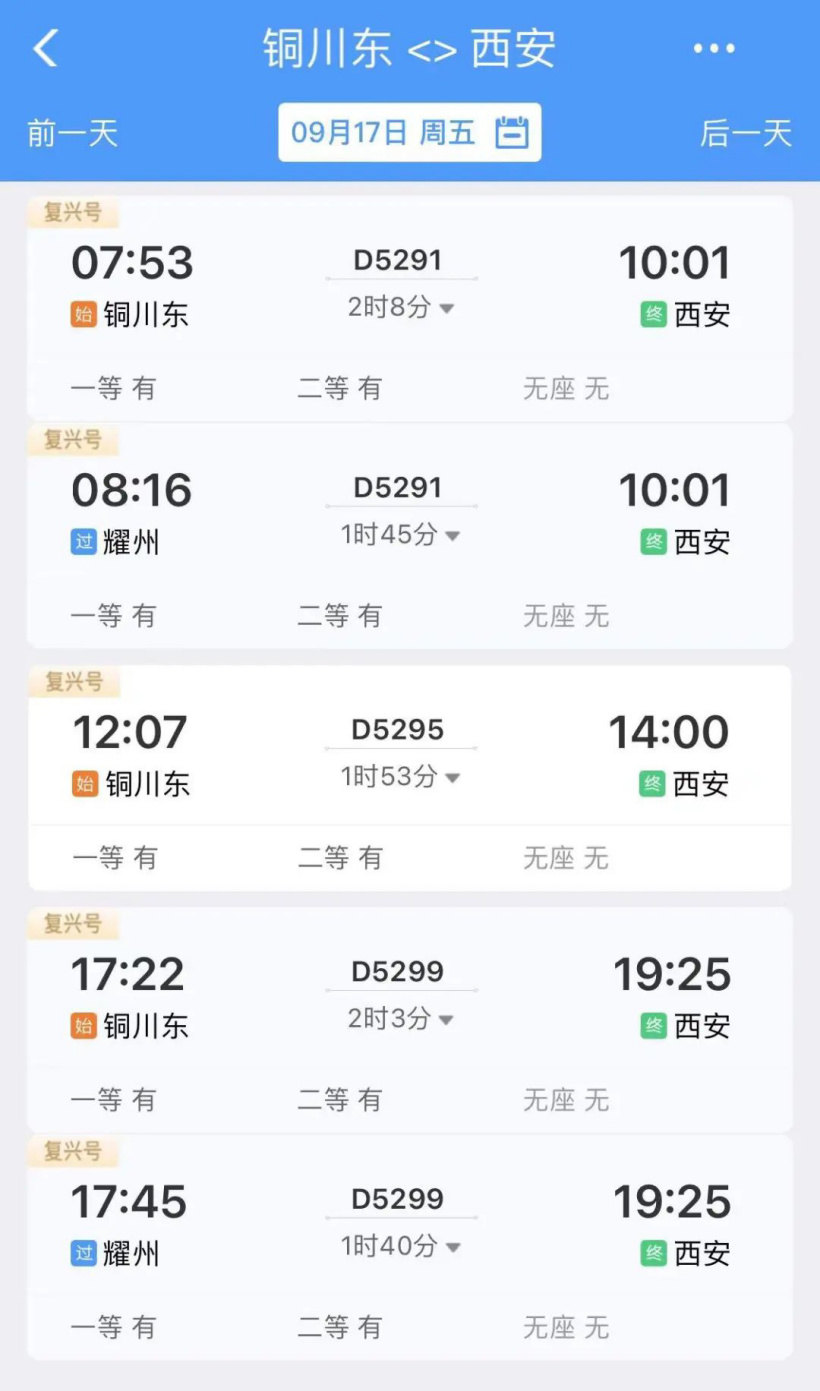 此次西安至铜川东间开行的复兴号列车各席别票价均实行 5.7 折优惠,广大旅客可通过中国铁路 12306 网站或 App 进行查询订票。