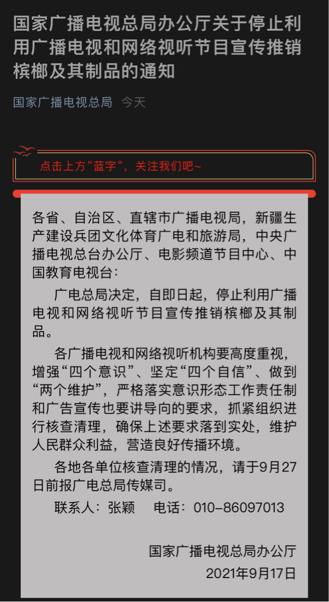 17 日消息 今天,国家广播电视总局办公厅发布了关于停止利用广播电视和网络视听节目宣传推销槟榔及其制品的通知。