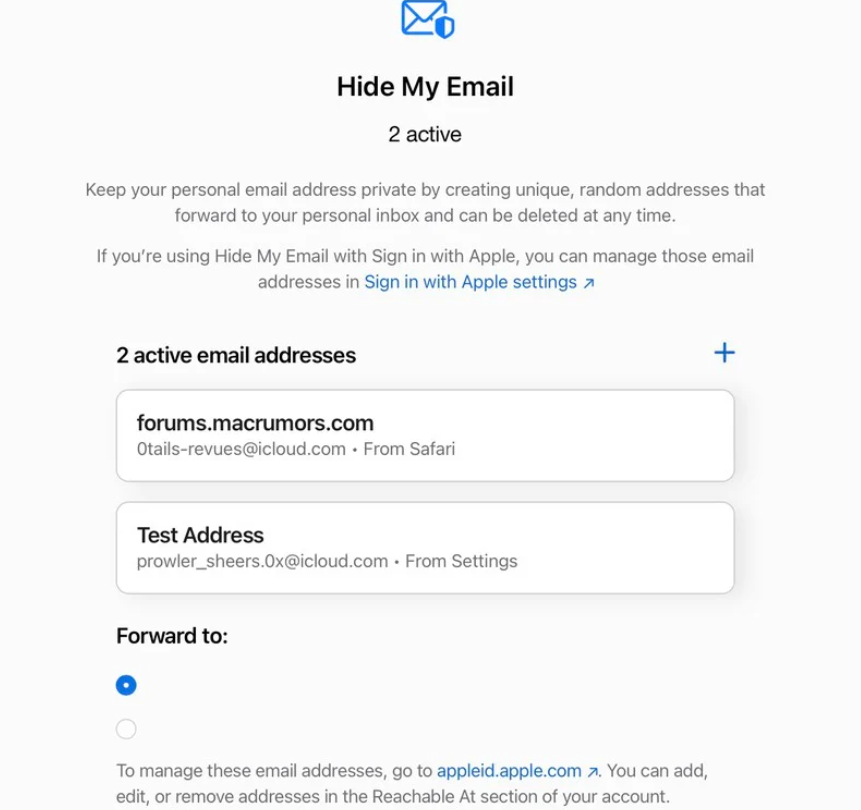 “隐藏我的电子邮件”旨在允许用户创建转发到主电子邮件地址的一次性电子邮件。使用此功能,用户可以为不同的网站创建不同的电子邮件地址,从而避免接收到垃圾邮件。