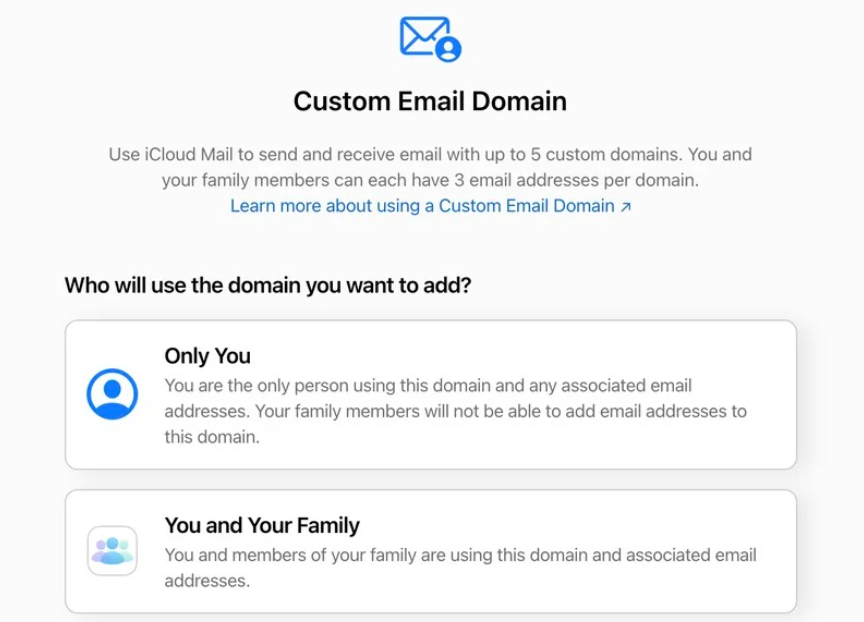 自定义电子邮件域名旨在允许客户使用自己的自定义电子邮件地址绑定 iCloud 邮箱,用户可以选择自己或者与家人一起共用一个自定义域名。