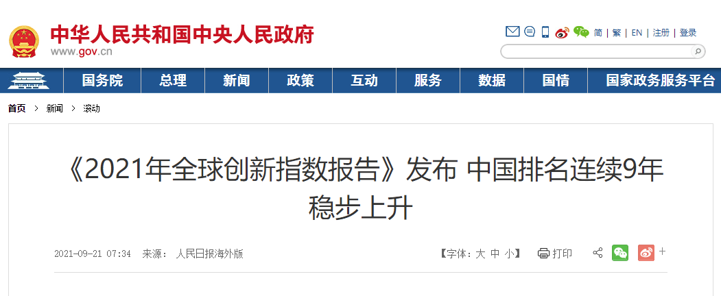 21 日消息 世界知识产权组织(WIPO)昨日发布了《2021 年全球创新指数》(以下简称《报告》),中国排名第 12 位,较去年上升 2 位。《报告》高度评价中国在创新方面取得的进步,