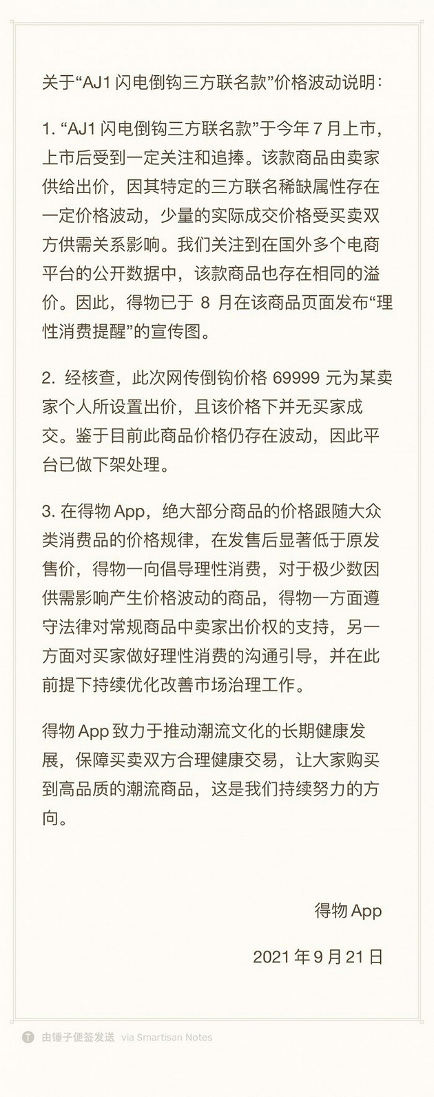 21 日消息 9 月 21 日,得物 App 发布《关于“AJ1 闪电倒钩三方联名款”价格波动说明》。得物表示,经核查,此次网传倒钩价格 69999 元为某卖家个人所设置出价,且该价格下并无买家成交。鉴于目前此商品价格仍存在波动,因此平台已做下架处理。