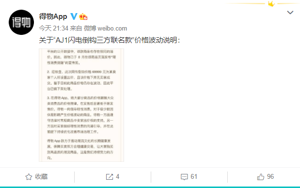 得物表示,“AJ1 闪电倒钩三方联名款”于今年 7 月上市,上市后受到一定关注和追捧。该款商品由卖家供给出价,因其特定的三方联名稀缺属性存在一定价格波动,少量的实际成交价格受买卖双方供需关系影响。公司关注到在国外多个电商平台的公开数据中,该款商品也存在相同的溢价。因此,得物已于 8 月在该商品页面发布“理性消费提醒”的宣传图。