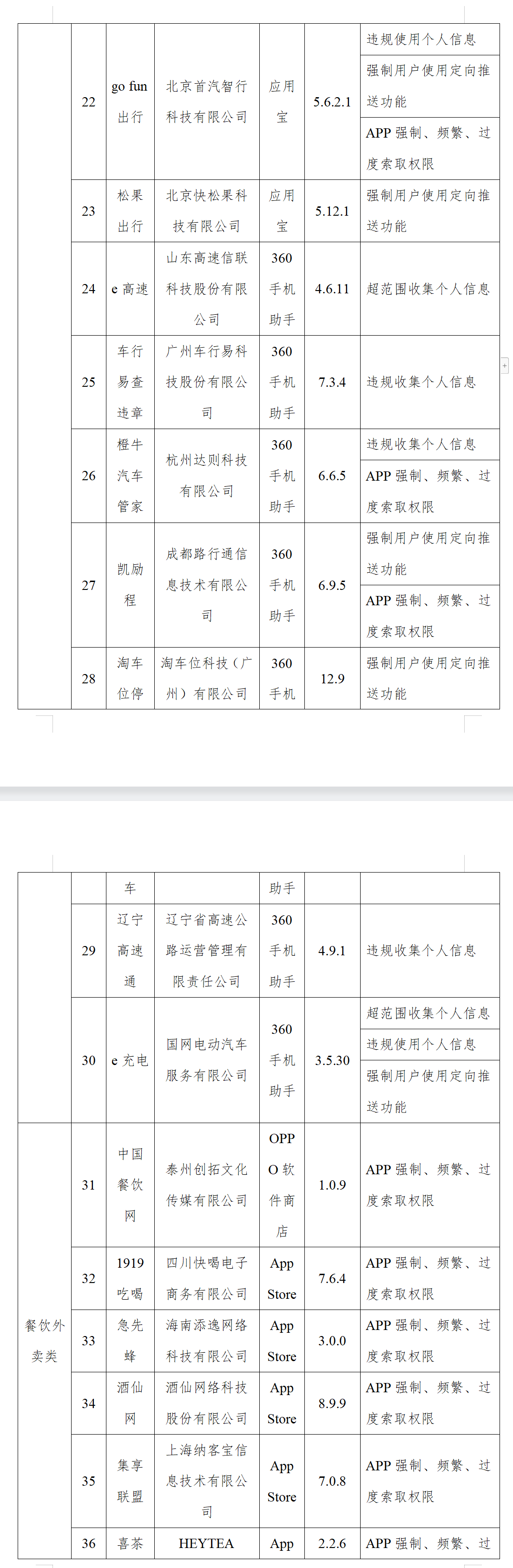 喜茶 GO App 强制、频繁、过度索取权限;南方航空超范围收集个人信息,APP 强制、频繁、过度索取权限;春秋航空强制用户使用定向推送功能;松果出行强制用户使用定向推送功能;掌上公交欺骗误导强迫用户等。