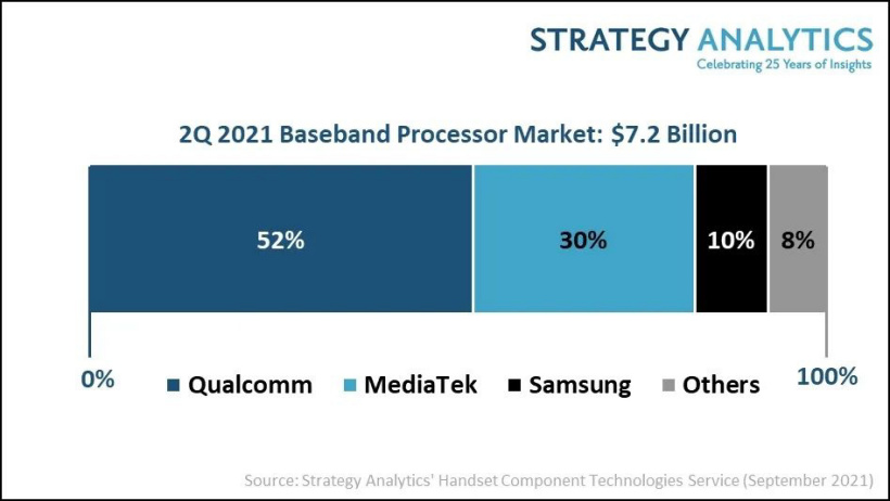 2021 年 Q2,高通以 52% 的收入份额领先基带芯片市场,其次是联发科(30%)和三星 LSI(10%)。