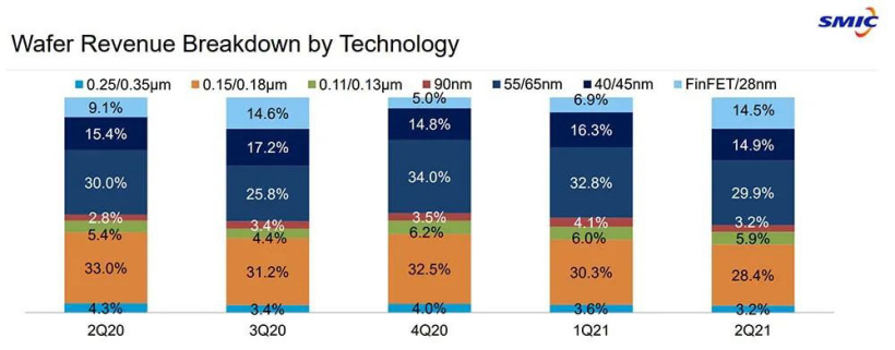 8 月份,中芯国际公布了其 2021 年第二季度财报,总营收 13.44 亿美元,其中 28nm 制程收入占比达 14.5%,该季度是中芯国际有史以来 28nm 占比最高的季度之一。