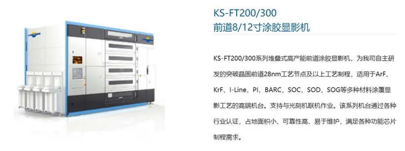 在这一领域中,芯源微电子设备有限公司是重要的国产供应商,其大部分股东为国资背景。目前,芯源公司的涂胶显影设备最高可用于 12 英寸单晶圆处理,其前道 KS-FT200/300 涂胶显影机可用于 28nm 及以上工艺节点。