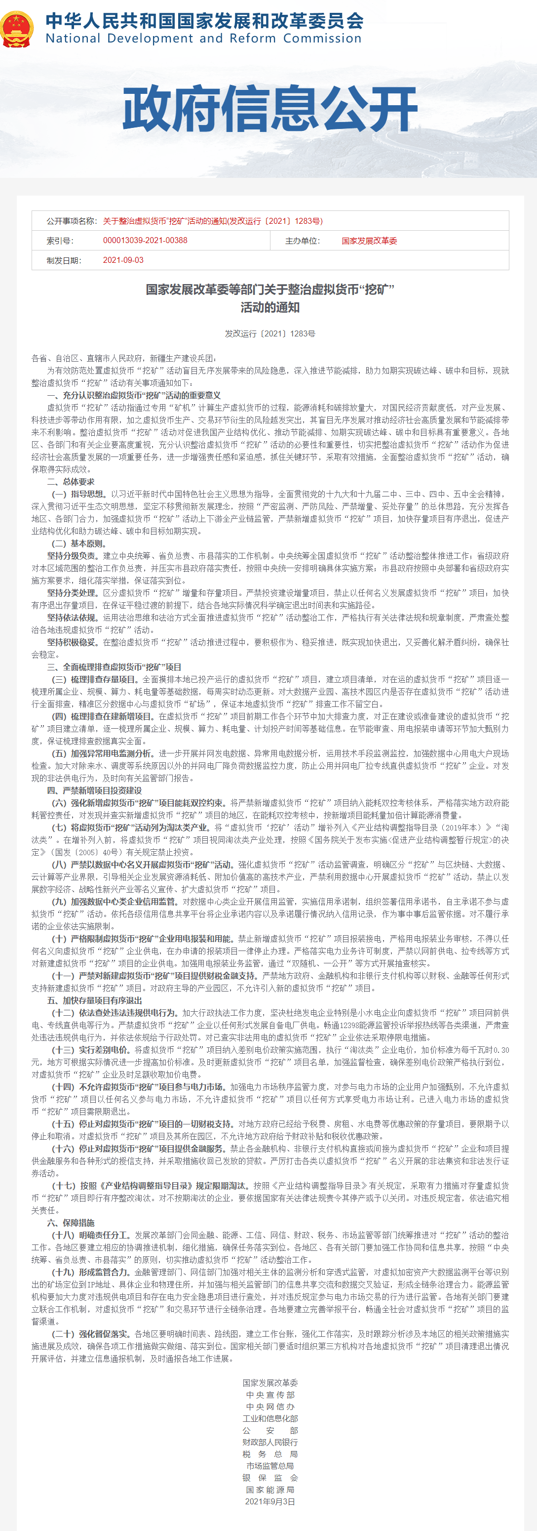 通知要求全面梳理排查虚拟货币“挖矿”项目、严禁新增项目投资建设、加快存量项目有序退出。
