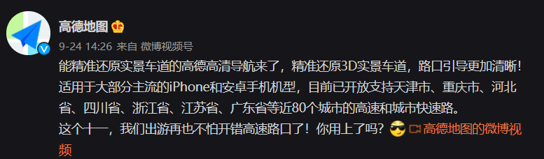 官方表示,高清导航适用于大部分主流的 iPhone 和安卓手机机型,目前已开放支持天津市、重庆市、河北省、四川省、浙江省、江苏省、广东省等近 80 个城市的高速和城市快速路。