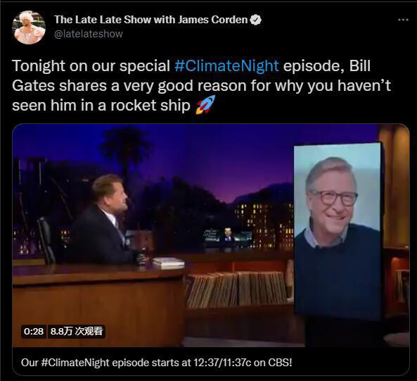 周三晚间,盖茨通过视频会议软件 Zoom 参加了《深夜秀》节目。当时,主持人詹姆斯?科登 (James Corden) 笑容满面地说:“我们请来了最好嘉宾!我可以个人名义说声‘谢谢’吗?因为他是唯一一个现在没有试图乘坐飞船逃离地球的亿万富翁。”