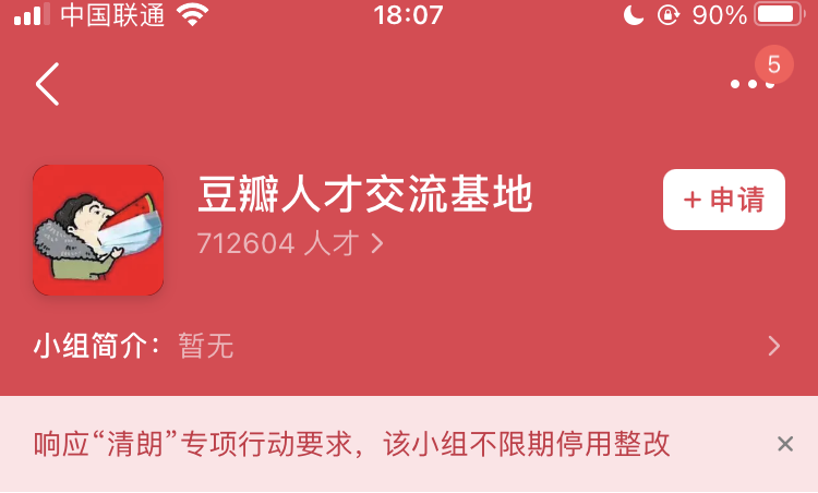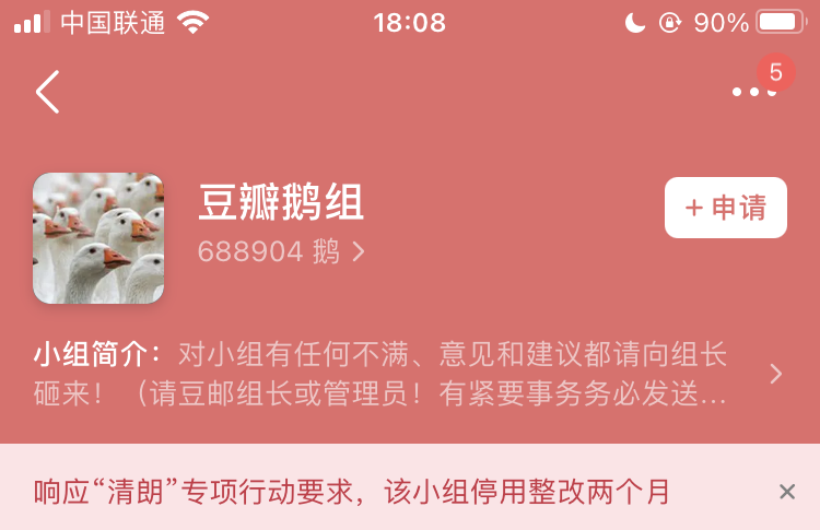 9 月 23 日,豆瓣 App 显示,为响应“清朗”专项行动要求,豆瓣鹅组被停用整改两个月。