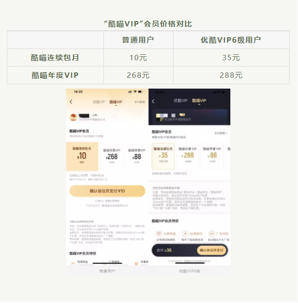 上海消保委还指出,普通用户和“优酷 VIP6 级”用户进相比,6 级账号的“酷喵 VIP”会员价格更贵。IT之家了解到,普通用户酷喵连续包月需要 10 元/月,而 6 级会员用户则需要 35 元;年费酷喵则分别需要 168 和 288 元,得出结论六级 VIP 用户更贵。