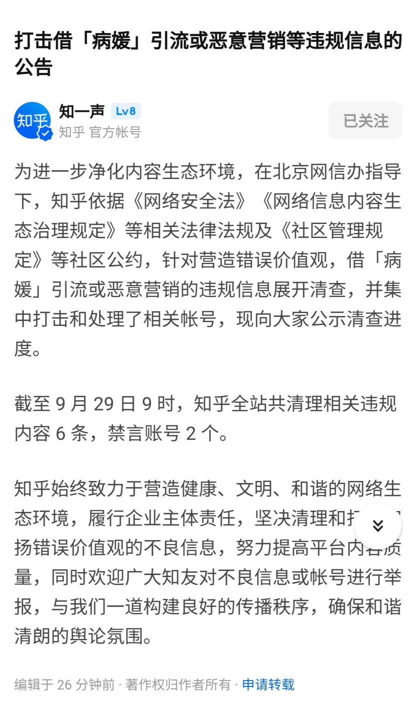 截至 9 月 29 日 9 时,知乎全站共清理相关违规内容 6 条,禁言账号 2 个。