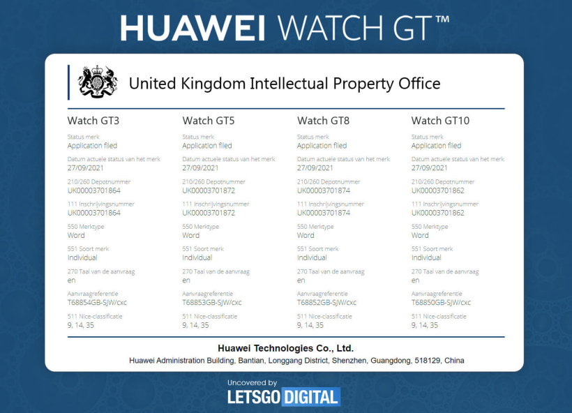 在本周初,华为也在英国申请同样的商标,因为英国不再是欧盟的一部分,具体时间是 2021 年 9 月 27 日,华为技术公司向英国知识产权局(UK IPO)申请了型号为 GT3、GT5、GT8 和 GT10 的商标。品牌被列为第 9/14/35 类,其中的描述是指手表和可穿戴设备,申请仍在“审查中”。