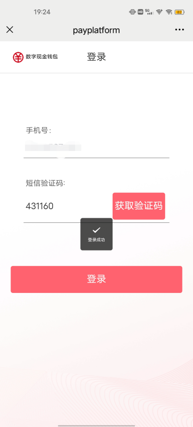 5G 消息自动识别用户手机号,输入短信验证码就可以快速登录数字人民币钱包。