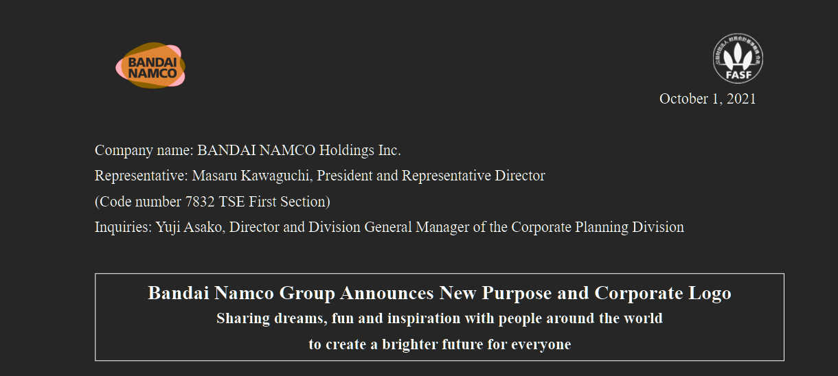 10 月 1 日消息 万代南梦宫集团今日宣布了新的使命、愿景和 Logo,新 Logo 将于 2022 年 4 月正式启用。