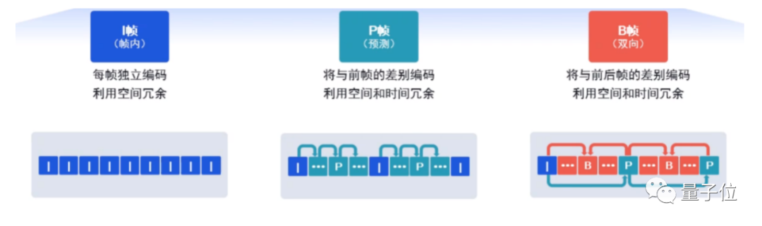 I 帧:帧内编码帧(intra picture)、P 帧:前向预测编码帧(predictive-frame)、B 帧:双向预测内插编码帧(bi-directional interpolated prediction frame)